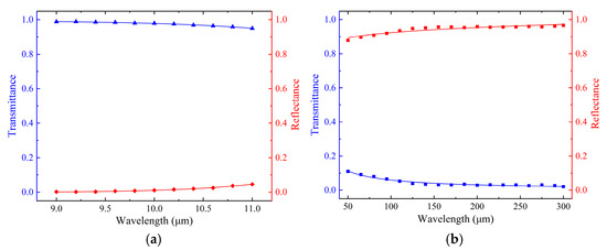 According to Figure 2 and Figure 3, a metal mesh with g = 9 μm, 2a = 1.5 μm, and t = 1 μm was obtained, and its theoretical transmittance for 9.6 μm pump light is 99%. To ascertain the feasibility of this metal mesh as an input coupler for OPGTL, the transmittance and reflectance of the metal mesh are simulated via the FDTD method, and the results are shown in Figure 5. The results indicate that the metal mesh exhibits a transmittance above 95% and a reflectance below 5% for 9–11 μm pump light. For 50–300 μm THz light, the reflectance of the metal mesh is found to be above 87%, with a transmittance below 12%. In addition, the transmittance of the metal mesh diminishes with the increase in wavelength, and the reflectance is opposite. For 9–11 μm pump light, the minimum transmittance of the metal mesh is recorded as 95.03%, and the corresponding maximum reflectance is 4.59%, as shown Figure 5a. Figure 5b illustrates that the metal mesh has a minimum reflectance of 87.86% and a maximum transmittance of 11.01% for THz light in the range of 50–300 μm. This shows that the designed metal mesh as an input coupler can be applied to high-efficient FP resonant cavity for CH3OH gas THz laser. As can be seen from Figure 5, the transmittance of the metal mesh to 9.6 μm pump light is found to be 98.36%, while its reflectance to 118.8 μm THz light is 93.37%.
