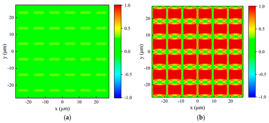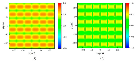 For the metal mesh with g = 9 μm, 2a = 1.5 μm, and t = 1 μm, the reflected and transmitted light fields in x-y plane under vertical incidence of the x-polarized plane wave of 9.6 μm were simulated by FDTD, as illustrated in Figure 6. In Figure 6 and similar figures below, the negative sign on the color scale represents the direction of the light field. The origin of the three-dimensional coordinate system is located at the center of the metal mesh, and the metal mesh is parallel to the x-y plane. The light source is situated at a half-wavelength distance above the metal mesh, and the plane wave is vertically incident along the opposite direction of z. The reflected light field is extracted at z = 5.3 μm and the transmitted light field is extracted at z = −0.5 μm. Figure 6 presents that due to the periodic structure of the metal mesh, the variation in the light field is also periodic. The average light field intensity of Figure 6a,b are 0.0135 and 0.9836 by calculation, respectively, which is basically consistent with the simulation of the transmittance of metal mesh to 9.6 μm light.