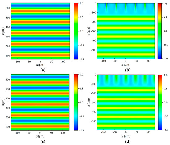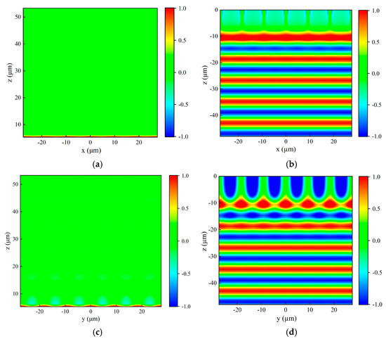 The reflected and transmitted light fields of the above metal mesh in x-z plane and y-z plane under the vertical incidence of the x-polarized plane wave of 9.6 μm are presented in Figure 7 by the FDTD method. The spatial position of the metal mesh and the light source is the same as described in the previous paragraph. The reflected light field is also extracted from above the light source, while the transmitted light field is obtained from the x-z and y-z planes positioned below the metal mesh. It can be clearly seen from Figure 7 that the reflected wavefront is now propagating along the z direction and the transmitted wavefront propagates in the opposite direction to z. This phenomenon indicates that the propagation direction of the vertically incident plane wave remains unchanged after passing through the metal mesh, continuing to propagate along the direction of incident light propagation, and the reflected light propagates in the opposite direction of incident light propagation. Figure 7 displays that the light field of the plane wave undergoes variations near the position of the metal mesh, probably attributed to the diffraction of light. As can be seen from Figure 5 and Figure 6, the metal mesh has a transmittance of 98.36% and a reflectance of 1.35% for 9.6 um light, so that the absorption losses, electrical losses, and diffraction losses of plane wave passing through metal mesh are approximately 0.29%.