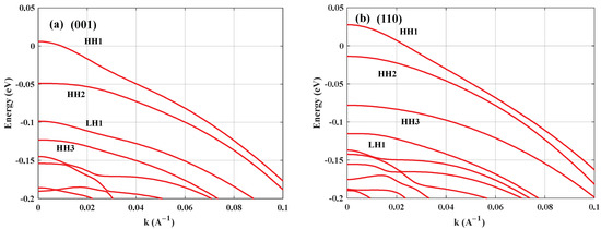 The density of states and average valence sub-band energy of the (001)- and (110)-oriented compressively strained AlGaInAs quantum wells are calculated. The corresponding results are shown in Figure 1a–d, respectively, where HH{n} and LH{n} applies for the heavy holes and light holes (n = 1, 2,…). The density of states (DOS) plays a critical role in determining carrier occupation in quantum wells, and the quasi-Fermi energy levels in both conduction and valence bands are governed by the density of states at given carrier concentrations. In Figure 1, the position of sub-bands strongly depends on the growth direction and the DOSs of both crystal-oriented quantum wells are stepped. For the (001) crystal orientation, the density of states (DOS) exhibits gradual suppression with increasing energy, attributable to enhanced valence bands splitting. However, the density of states (DOS) already exceeds the band-edge value by a factor of four at approximately 50 meV below the band edge (see Table 1). On the other hand, the density of states in the (110) crystal-oriented quantum well is less than 2 × 1018 m−2eV−1in the energy range of 97 meV. It is noticed in Figure 1b that for the (110) orientation, the energy separation between the first hole band (HH1) and the next bands (HH2, LH1) is much larger than in the (001) case, which is the primary reason that the DOS for the (110) case remains low over a wider energy range. The reduced density of states (DOS) near the valence band edge decreases the available carrier density for population inversion, consequently lowering the laser threshold current. In addition, it is expected to increase the differential gain of the quantum well.