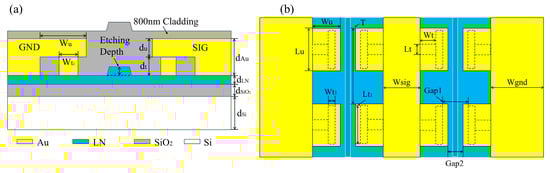 Figure 1 presents the optimized device architecture of the proposed X-cut TFLN Mach–Zehnder modulator (MZM). Figure 1a depicts the cross-sectional epitaxial configuration of the active modulation region, while Figure 1b illustrates the microwave optical velocity-matched copropagating electrode design. The multilayer heterostructure consists of (from bottom to top) the following: a 500 μm-thick silicon substrate, 4.7 μm thermally grown SiO2; buffer layer, 0.6 μm single-crystal X-cut LiNbO3; film incorporating 1.5 μm-wide ridge waveguides, and an 800 nm-thick SiO2 upper cladding layer. By leveraging the inherent push–pull electro-optic mechanism characteristic of X-cut LiNbO3 platforms, where the refractive index modulation depends on the crystal orientation governed by the third-rank electro-optic tensor (), the implemented ground–signal–ground (GSG) electrode configuration generates complementary phase shifts () in the dual interferometric arms through domain inversion engineering [14]. This design strategy effectively enhances the half-wave voltage-length product () performance. Table 1 lists the specific parameters of the structure, while subsequent chapters will detail the design and simulation processes.