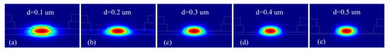 (a–e) Electric field intensity distribution variations at different etching depths.