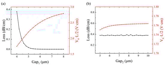 Optical loss and half-wave voltage product under varying (a) gap1 and (b) gap2.