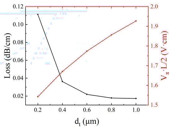 Subsequently, we conducted simulations on the thickness of the dual-layer electrodes. Given that the total thickness of the T and U electrode layers matches the main electrode thickness, we exclusively present the simulation results for the lower T-layer thickness, as shown in Figure 5. It is evident that with the variations in T-layer thickness, the demonstrates a nearly linear variation pattern, whereas the optical loss displays an exponential variation characteristic. Through comprehensive consideration, dt = 0.6 μm was determined as the optimal configuration.