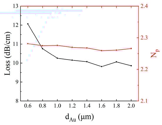 Numerical simulations demonstrate the stabilization of RF losses beyond a 1 μm electrode thickness. This phenomenon stems from current crowding suppression when metallization thickness surpasses the skin depth threshold, thereby reducing resistance-induced dissipation through the mitigation of current over-concentration. Crucially, the effective microwave refractive index (Np) exhibits thickness-independent behavior with insignificant parametric variation. Electrode thickness optimization therefore principally addresses microwave attenuation constraints, though requires the integrated consideration of fabrication economics and potential electric field distortion from excessive metallization. Comprehensive multi-criteria analysis identifies 1.2 μm as the optimal thickness configuration. This parameter selection maintains subcritical RF losses while achieving performance–cost equilibrium, effectively suppressing conductor-induced power dissipation without introducing the fabrication complexities or field uniformity degradation associated with over-thickened electrodes.