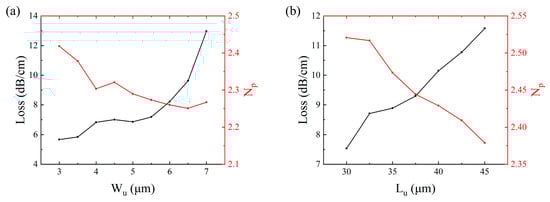The investigation was extended to microwave propagation modulation characteristics in U-shaped electrode architectures. Computational electromagnetic analysis was employed to resolve the parametric dependencies of electrode width (Wu) and length (Lu) on the RF loss and Np. Figure 7 presents the systematic simulation results obtained at a 60 GHz operational frequency. For Wu variation from 3 μm to 7 μm, the Np exhibited monotonic reduction from 2.41 to 2.25, while microwave attenuation escalated significantly from 5.67 dB/cm to 12.96 dB/cm. Analogously, the parametric expansion of Lu from 30 μm to 45 μm induced progressive Np reduction from 2.52 to 2.37, accompanied by microwave loss intensification from 7.53 dB/cm to 11.58 dB/cm.