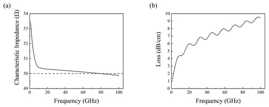 (a) Characteristic impedance and (b) RF loss characteristics under a fixed device length of 0.5 cm.