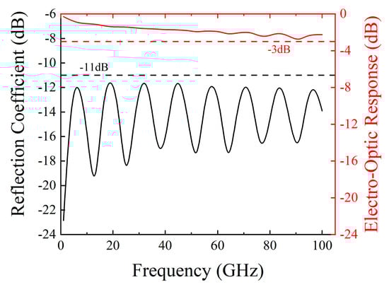 The electro-optic response characteristics of the modulator were analytically derived using Equation (5). Figure 11 depicts the spectral response of the reflection coefficient along with the electro-optic modulation characteristics. Numerical evaluations indicate a modulation bandwidth surpassing 100 GHz, while the reflection coefficient is maintained below the threshold of −11 dB across the full operational bandwidth; this result satisfies the core specification, requiring a reflection coefficient of less than −10 dB in engineering applications.