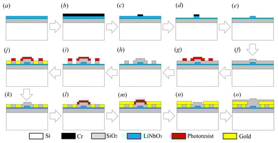 Schematic diagram of TFLN modulator fabrication process. (a) Wafer cleaning; (b) Cr film deposition; (c) Cr photolithography and etching; (d) LN etching; (e) Cr stripping; (f) SiO2 deposition; (g) photoresist patterning and etching; (h) SiO2 etching and photoresist stripping; (i) photoresist patterning; (j) growth of first electrode layer; (k) photoresist stripping; (l) photoresist patterning; (m) growth of second electrode layer; (n) photoresist stripping; and (o) SiO2 passivation layer deposition.