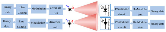 Figure 1 shows the block diagram of a 2 × 2 MIMO-based VLC system. According to this diagram, the data source generates binary data, which is passed through the line coding that uses NRZ or RZ techniques to convert binary data into electric pulses. Next, a certain type of modulation technique is used to modulate an electric pulse signal over a continuous wave light signal and produce a modulated light signal.