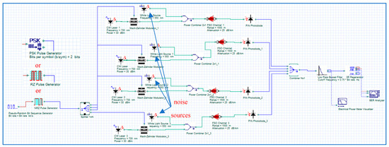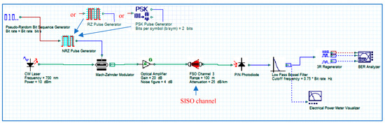 To evaluate the performance of the presented MIMO–VLC system, we utilize the optical system simulation software OptiSystem 21.0. As explained above, the main contribution of this study is to provide a comparative analysis of SISO–VLC and MIMO–VLC without and with the influence of ambient light with different line coding techniques.