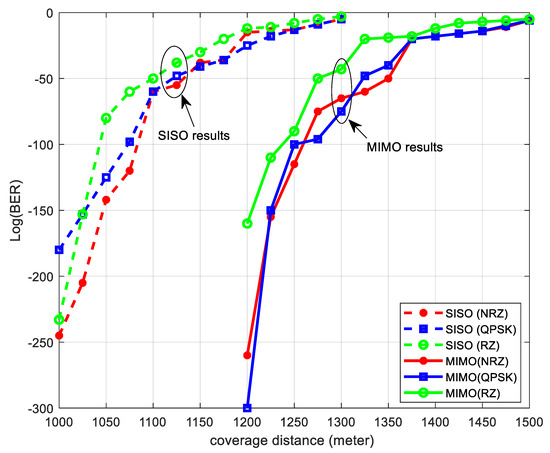 As demonstrated in Table 3, the MIMO system achieves greater transmission distances compared to the SISO system. The results show that MIMO systems, particularly with NRZ and QPSK modulation, achieve longer distances, while RZ performs the worst in both systems.
