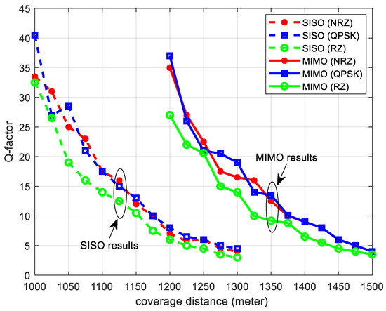 It is important to note that minor inconsistencies between Q-factor and BER results may occur, particularly near the performance degradation threshold. This is due to the nonlinear relationship between the Q-factor and BER, especially when modulation schemes are subjected to complex channel conditions, such as ISI. While the Q-factor provides a statistical measure of signal quality based on the separation between logic levels and noise margins, BER is a direct measure of bit errors over time. As a result, transient effects, such as variations in noise, phase distortions, or symbol misalignments, may cause short-range discrepancies between the two metrics (as in SISO scenario 1000 to 1025 m). These effects are more pronounced at the edge of the communication range, where signal degradation accelerates, and different modulation schemes respond differently to distortion. Such variations are expected and do not imply fundamental contradictions but rather reflect the sensitivity of each metric to different aspects of signal quality.