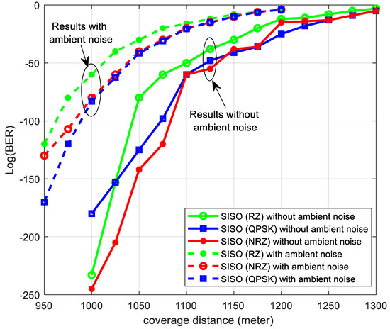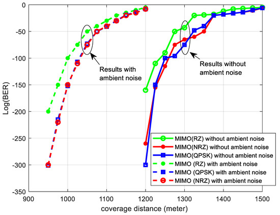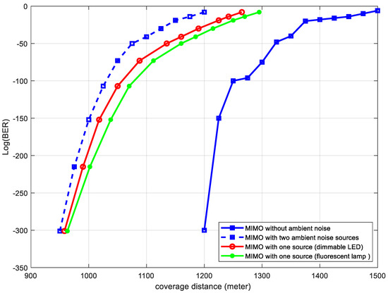 Similarly, Figure 13 displays the impact on the MIMO–VLC system, where at the same BER level, the coverage distance drops from 1325 m to 1075 m, marking an 18.9% reduction. Despite this, the overall performance gain provided by MIMO’s diversity outweighs the losses caused by ambient noise.