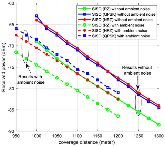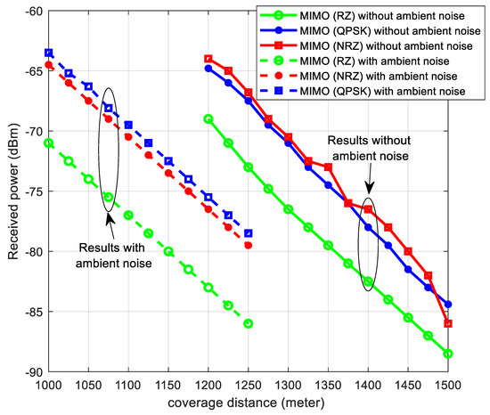 Figure 14 and Figure 15 illustrate the received power for SISO–VLC and MIMO–VLC systems, respectively, both with and without ambient noise. The effect of ambient noise is evident in the performance degradation. For the SISO–VLC system, the coverage distance decreases from 1087 m to 1020 m, a reduction of 6.2%. In the MIMO–VLC system, the coverage distance drops from 1280 m to 1105 m, marking a 13.6% reduction at a target received power of −70 dBm.