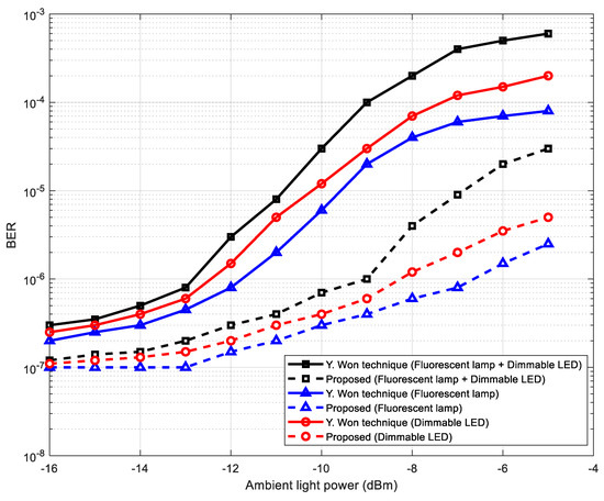 In this subsection, we consider the effects of ambient light noise sources. As explained above, two ambient noise sources are considered, which are fluorescent lamps and white LEDs as presented in Section 3.2.