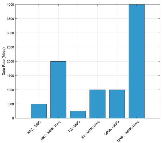 Figure 19 presents a comparison of the achievable data transmission rates for the considered modulation schemes under both SISO and MIMO configurations. The results demonstrate that QPSK outperforms both NRZ and RZ in terms of data rate due to its higher spectral efficiency, achieving up to 1000 Mbps in SISO and 4000 Mbps in MIMO (4 × 4) configurations. NRZ, with a spectral efficiency of 1 bit/symbol, provides a balanced performance with data rates of 500 Mbps (SISO) and 2000 Mbps (MIMO), making it a viable choice when both robustness and throughput are important. Conversely, RZ shows the lowest data rates (250 Mbps in SISO and 1000 Mbps in MIMO) due to its lower duty cycle and lower energy per symbol. The use of MIMO architecture significantly enhances data rate across all modulation schemes through spatial multiplexing, showing a 4-times increase in data rate compared to SISO when using 4 × 4 configurations.