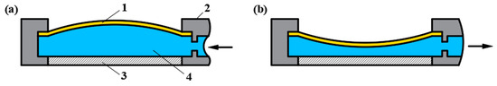 Schematic diagram of hydraulic liquid lens. 1—elastic film; 2—container; 3—glass substrate; 4—fluid medium. (a) Positive focal power form; (b) Negative focal power form. The arrow represents the direction of the pressurized liquid.