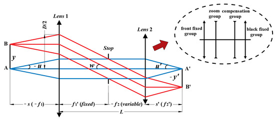 Where, the parameters y and y’ denote the semi-object field of view and the semi-image field of view, respectively. The f1′ and f2′ are the rear focal lengths of Lenses 1 and 2, respectively. The w represents the angle between the chief ray passing through the first group and the optical axis, which is also the field of view angle of Lens 2. While u and u’ denote the aperture angle of object plane and image plane, and s and s’ denote the distances of the object and image, respectively.