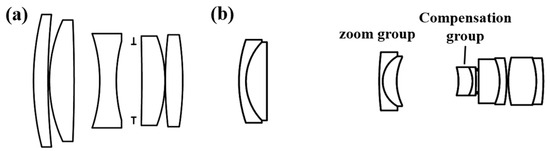 Initial structure of optical system. (a) The initial structure of the front group (Lens 1) optical system; (b) The initial structure of the rear group (Lens 2) optical system.