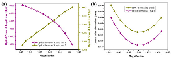 System characteristics at various magnifications: (a) the optical power of the liquid lens at various magnifications; (b) lateral color aberrations of the double-sided telecentric zoom system at various magnifications.
