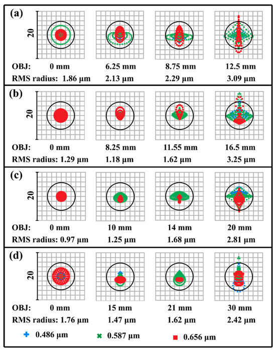 Spot diagram: (a) spot diagram at a magnification of −0.44; (b) spot diagram at a magnification of −0.33×; (c) spot diagram at a magnification of −0.275×; (d) spot diagram at a magnification of −0.183×.