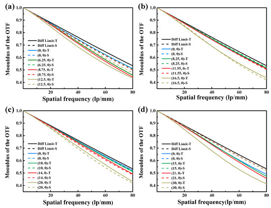 MTF curves: (a) MTF curve at a magnification of −0.44×; (b) MTF curve at a magnification of −0.33×; (c) MTF curve at a magnification of −0.275×; (d) MTF curve at a magnification of −0.183×.