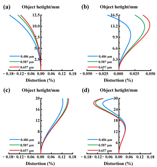 The distortion of double-sided telecentric zoom optical system: (a) the distortion at magnification of −0.44×; (b) the distortion at magnification of −0.33×; (c) the distortion at magnification of −0.275×; (d) the distortion at magnification of −0.183×.