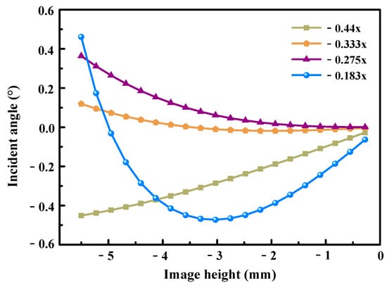 Telecentricity is a critical parameter for assessing the performance of a double telecentric lens. It represents the angle between the chief ray and the optical axis, where an angle of zero signifies absolute telecentricity. Figure 10 depicts the distribution of incident angles at the image plane, wherein these angles serve as an indicator of the telecentricity. As illustrated in the figure, at magnifications of −0.44×, −0.333×, −0.275×, and −0.183×, the corresponding maximum incident angles within the full field of view are 0.45°, 0.12°, 0.36°, and −0.46°, respectively. These results indicate that the system’s telecentricity remains below 1°, satisfying the design specification.
