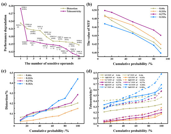 Tolerance analysis results: (a) the most sensitive operand; (b) the cumulative probability of MTF; (c) the cumulative probability of distortion; (d) the cumulative probability of telecentricity.