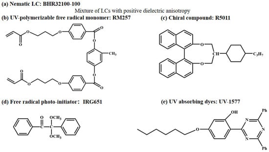 Figure 1 presents the chemical structures of all components utilized in this research. The experimental formulation incorporated nematic liquid crystal BHR32100-100 (ne = 1.752, no = 1.517, Δn = (ne − no) = 0.235; Beijing Bayi Space LCD Technology Co., Ltd., Beijing, China); chiral dopant R5011 (Shijiazhuang Chengzhi Yonghua Display Material Co., Ltd., Shijiazhuang, China); free-radical photo-initiator IRG651 (Aladdin Co., Ltd., Shanghai, China); organic UV-absorbing dye UV-1577 (98% purity; HEOWNS Co., Ltd., Tianjin, China); inorganic UV-absorbing zinc oxide nanoparticles (50 nm particle size, 30 wt% dispersion; Shanghai Yien Chemical Technology Co., Ltd., Shanghai, China); and UV-polymerizable monomer RM257 (588.6 g/mol; Beijing Bayi Space LCD Technology Co., Ltd., Beijing, China).