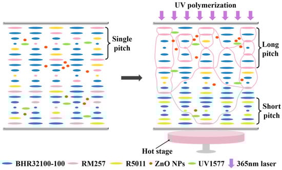 For sample preparation, constituent materials were precisely weighed per Table 1 formulations using the electronic scale and transferred to labeled centrifuge tubes. Each CLC mixture received 1 mL organic solvent ethyl acetate, followed by vigorous vortex mixing (1 min) and ultrasonic homogenization (60 min) to ensure uniform ZnO NPs dispersion. Solvent evaporation was achieved through thermal treatment at 70 °C for 8 h in the oven. Following solvent evaporation, the tubes were removed and cooled to room temperature. All procedures preceding polymerization were conducted under light-free conditions to prevent premature photoreactions. The homogeneous mixtures were loaded into liquid crystal cells via capillary action using a curved needle. The liquid crystal cells were constructed with 40 μm polyethylene terephthalate (PET) spacers and glass substrates pre-coated with 3 wt% PVA solution. Substrates were dried and oriented by rubbing with a flannel to allow the molecules to obtain planar orientation. The samples were then polymerized under different conditions.