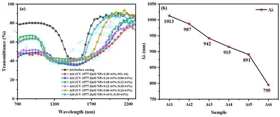 Group At samples: variation of (a) transmission spectra and (b) Δλ with UV-absorbing dyes mass fraction.