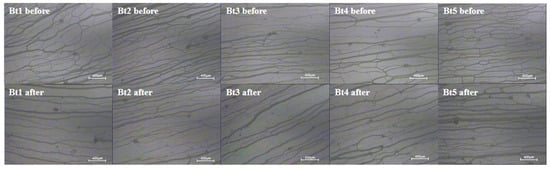POM images (scale bars: 400 μm) of Bt group samples before and after curing at 2.0 mW/cm2 light intensity for 20 min.