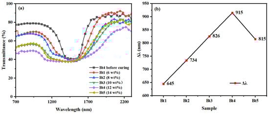 Group Bt samples: variation of (a) transmission spectra and (b) Δλ with RM257 mass fraction.