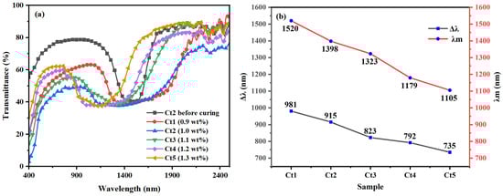 Group Ct samples: variation of (a) transmission spectra and (b) Δλ and λm with R5011 mass fraction.