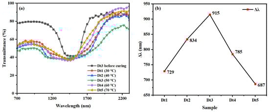 Group Dt samples: variation of (a) transmission spectra and (b) Δλ with polymerization temperature.