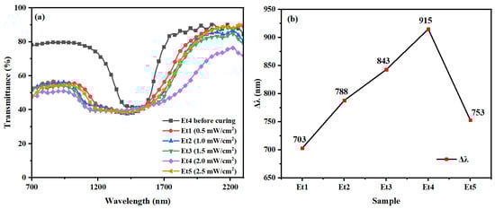 Group Et samples: variation of (a) transmission spectra and (b) Δλ with UV intensity.
