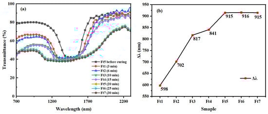 Group Ft samples: variation of (a) transmission spectra and (b) Δλ with polymerization time.