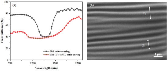 Figure 11a compares the transmission spectra of sample Gt1 (BHR32100-100/RM257/R5011/IRG651/UV-1577/ZnO NPs = 86.40/12.00/1.00/0.30/0.12/0.18) before polymerization and after 20 min UV irradiation at 50 °C (2.0 mW/cm2). The optimal sample achieved a broadened Δλ of 915 nm after polymerization. It is shown that the reflective bandwidth of the samples can be significantly broadened in the preparation of films by photo-induced molecular diffusion using the organic UV-absorbing dye UV-1577 doped with a liquid crystal system containing inorganic UV-absorbing dye ZnO NPs. Our previous experiments demonstrated that the reflection bandwidth of broadband reflective films prepared by the action of UV-327-assisted ZnO NPs was less than 900 nm []. Figure 11b shows an SEM image taken of the cross-section of the film after polymerization of the Gt1 sample, revealing distinct bright stripes corresponding to the helical pitch. It is observed that the pitch values satisfy P1 (≈1191 nm) > P2 (≈860 nm), which verifies the establishment of a pitch gradient distribution along the thickness direction of the film. This gradient structure directly results from UV-induced molecular diffusion causing non-uniform chiral dopant distribution along the thickness, which generates the observed broadband reflection.