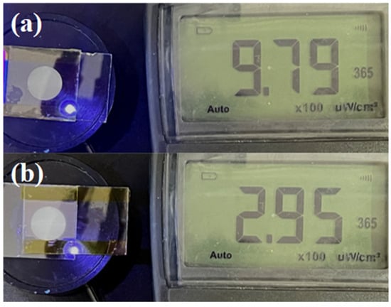Ultraviolet radiation, an invisible component of the electromagnetic spectrum, poses significant health risks due to its capacity to trigger photochemical reactions upon excessive exposure. Prolonged UV irradiation adversely affects human physiological functions, particularly causing damage to the skin, eyes, and immune system. Therefore, it is particularly crucial to protect against UV radiation. Leveraging the synergistic UV-absorbing properties of UV-1577 and ZnO NPs, we conducted a UV shielding test at 365 nm between the best sample Gt1 and the blank sample. As illustrated in Figure 12, under identical UV irradiation conditions, the blank sample exhibited a UV transmittance intensity of 0.979 mW/cm2 (Figure 12a), whereas the Gt1 film demonstrated a significantly reduced transmittance of 0.295 mW/cm2 (Figure 12b), corresponding to a UV shielding efficiency of 69.9%. Uthirakumar et al. [] reported that a PMMA film containing 1 wt% CQD/N-ZnO exhibited a UV shielding efficiency of 62% at 100 μm thickness. This efficiency increased to 92% when the thickness was raised to 250 μm, which is more than six times thicker than our samples. In contrast, our system leverages the synergistic effect between UV-1577 and ZnO NPs. It demonstrates excellent UV shielding performance under relatively simple preparation conditions, without requiring complex structural design of the materials.