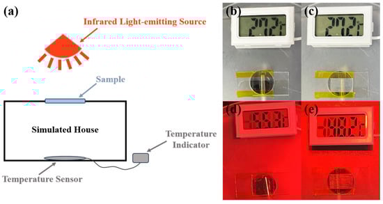Infrared shielding test of samples: (a) schematic diagram, (b) temperature of the blank sample before irradiation, (c) temperature of the best sample Gt1 before irradiation, (d) temperature of the blank sample after 10 min irradiation, and (e) temperature of the best sample Gt1 after 10 min irradiation.