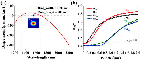 Simultaneously, the effective refractive indices of waveguides with different widths at a thickness of 800 nm are shown in Figure 1b. Here, the red and green lines represent the first and second TE-like modes, respectively, and the dark and blue lines show the first and second TM-like modes, respectively. As illustrated in Figure 1b, at around an 800 nm width, the first TE and first TM modes cross. To guarantee a single-mode operation status and obtain total internal reflection, the effective refractive index of the core waveguide needs to be higher than that of the silica cladding (1.44), which is indicated by a dashed line. In Figure 1b, it is obvious that when the core waveguide width is around 700 nm, the waveguide supports only a single TE fundamental mode and a single TM fundamental mode, thus satisfying the single-mode condition. Therefore, to satisfy the single-mode condition requirement, the bus waveguide width in the micro-cavity is selected to be , and the ring waveguide width is designed as to obtain anomalous dispersion.