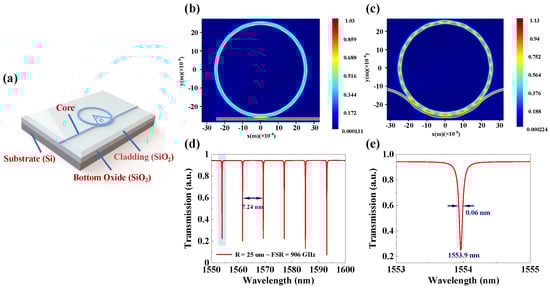 Design of a micro-cavity for a comb. (a) Cross-sectional view of the micro-ring resonator structure. (b) Field distribution of the ring resonator with a straight waveguide. (c) Field distribution of the ring resonator with a bent waveguide. (d) Transmission spectrum at the Through port of the micro-ring resonator, with a radius of and a free spectral range of approximately 906 GHz. (e) Zoomed-in spectrum at 1553.9 nm.