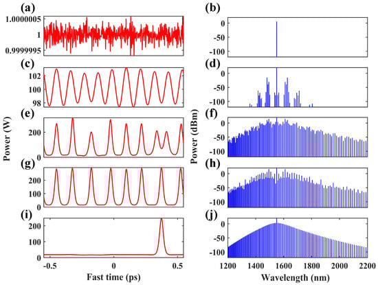 We set the frequency modes to to strengthen the numerical simulation efficiency. Initially, as shown in Figure 3a, the pump’s initial detuning was set to −0.005, being kept in the blue-detuned region, and Gaussian noise was added to the pump to mimic experimental disturbances. Additionally, its frequency domain corresponds to a single comb line at a wavelength of 1550 nm in Figure 3b. The central wavelength of the pump light was then adjusted, being swept from the blue-detuned to the red-detuned region at a rate of 2 × /ns. The tuning was halted once a comparatively stable multi-soliton state was achieved in the cavity. Figure 3 illustrates that both intra-cavity optical solitons and Kerr optical frequency combs sequentially undergo the main stages of Turing rolls, chaos, multi-soliton phenomena, and single-soliton phenomena, respectively.