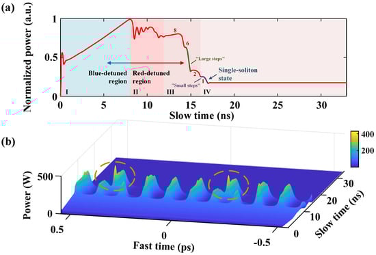 As depicted in Figure 3g,h, by further detuning, the intracavity power diminishes, leading to the emergence of multiple stable pulses in the time domain, which indicates a multi-soliton state. As the soliton state emerges from the chaotic state, the number of generated solitons is random. During the transition from the chaotic to the multi-soliton state, there is a change from multi-pulse to single-pulse behavior, as indicated by the brown circled area in Figure 4b (at this point, the stable multi-soliton state has not been fully established yet). The evolution of intracavity power in region III of Figure 4a shows a stepwise decrease in power. This occurs because the power drops rapidly over a short period, which reduces the parametric gain of soliton pulses. When the gain is lower than the loss, multiple solitons decay due to intracavity losses. During this process, adjacent solitons can be merged into an individual soliton, which brings about “large steps” that represent the simultaneous decay of multiple solitons observed in the power evolution of Figure 4a, yet “small steps” indicate the annihilation of individual solitons, as depicted in region IV of Figure 4a. At this stage, the optical comb has already occupied each resonance mode in the frequency domain.