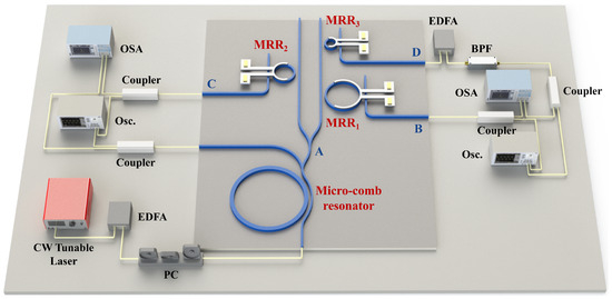 Schematic of the tunable optical micro-comb generation system. CW Tunable Laser, continuous-wave tunable laser; EDFA, erbium-doped fiber amplifier; PC, polarization controller; OSA, optical spectrum analyzer; Osc., optical oscilloscope; BPF, band-pass filter; Micro-comb resonator, ring resonator for micro-comb generation; to , ring resonators for comb filtering.