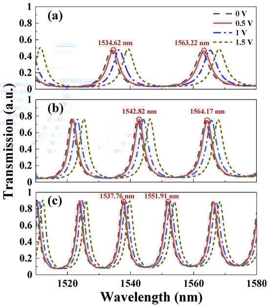 Insertion loss (IL), expressed as , can be calculated from the ratio of the peak normalized transmission (the amplitude in Figure 7b–d) to the ideal transmission, and the normalized value of “ideal transmission” is 1. Thus, the insertion losses of , , and at 1550 nm can be obtained from our simulation results, which are 0.47 dB, 1.1 dB, and 2.64 dB, respectively. A lower insertion loss means that less energy will be lost during the optical signal transmission if the component structure is designed with superior optical field confinement. Notably, the IL can be optimized by selecting materials with lower absorption coefficients or precisely controlling the parameters of the micro-ring resonator to avoid mode mismatch and scattering.