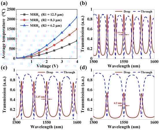 A voltage ranging from 0 to 4 V (with intervals of 0.5 V) is applied to the Au electrodes for heat conduction. The transmission spectra at the drop port for the triple add-drop micro-ring filters applied with variable voltages are shown in Figure 6, and the wavelengths of the resonant peaks are marked by red circles. As the applied voltages increase, the offsets of the resonant peak red-shift increase accordingly for , , and because of thermo-optic effects. In addition, the drifting of the resonant wavelength rises as the FSR increases with an equal voltage applied, and the 3-dB bandwidth of each micro-ring filter becomes broader as well. Moreover, the structural parameters are optimized to guarantee that the 3-dB bandwidth of the triple-ring is relatively less than the respective comb spacing, thus achieving fine filtering effects. As shown in Figure 7a, the relations between the intra-cavity temperature and the applied voltage on triple-ring waveguides are analyzed using the finite element method (FEM). Obviously, the heating temperature is positively correlated with the applied voltages. As depicted in Figure 7b–d, the resonant peaks of the filters are finely adjusted to align with the wavelengths of the optical frequency combs, and the 3-dB bandwidths of , , and at 1550 nm are 2.64 nm, 3.45 nm, and 4.2 nm, respectively. At the same time, the extinction ratios of the triple-ring drop as the radii of the corresponding micro-ring decrease, which is illustrated in Figure 7b–d. Therefore, an EDFA is subsequently distributed at the drop port of to improve its filtering performance for higher extinction ratios. In consideration of possible coupling effects and potential interference between cascaded micro-rings, which may bring about extra transmission loss, a sufficient spatial distance is reserved between each micro-cavity to ensure that the triple-ring filters do not interfere with each other.
