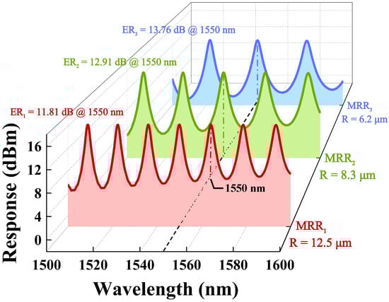 A pump light source with an output power of 1 W (30 dBm), as depicted in the system in Figure 5, is utilized as the CW tunable laser. After passing through the Y-branch waveguide at point A, the output optical signal of the micro-comb resonator is split into two parts as the input optical signals of and , whose optical powers are both 16.76 dBm. Similarly, the output light of at its through port becomes the input optical signal of , which is 15.86 dBm. Based on the above results, the wavelength responses of , , and are obtained, respectively, as depicted in Figure 8. Furthermore, as illustrated in Figure 8, the extinction ratios (ERs), denoted as , of , , and at a wavelength of 1550 nm are 11.81 dB, 12.91 dB, and 13.76 dB, respectively, which can be obtained from the transmission power ratio of the resonant peak to valley at the drop port. In addition, the ER can also be derived from the ratio of the maximum to the minimum power of the normalized transmission spectra at a specific wavelength, as shown in Figure 7b–d.